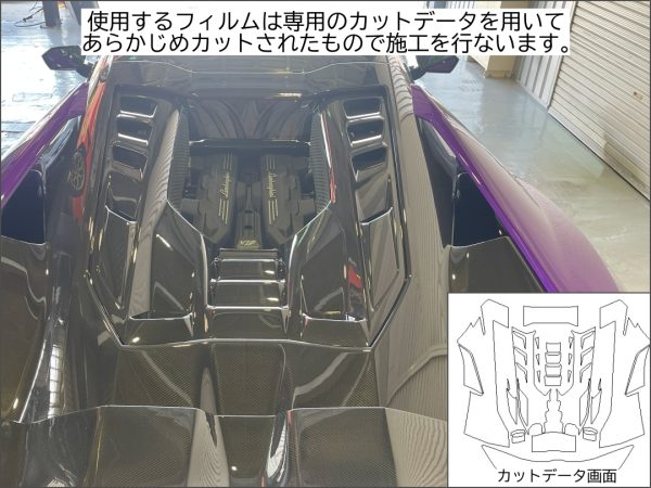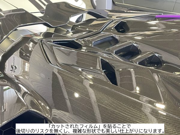 エンジンフードのような複雑な形状に対してぴったり合うフィルムを準備し施工することで後からカットを行う必要がなく、美しいカットラインで施工することができます。
