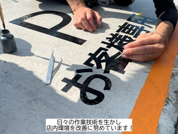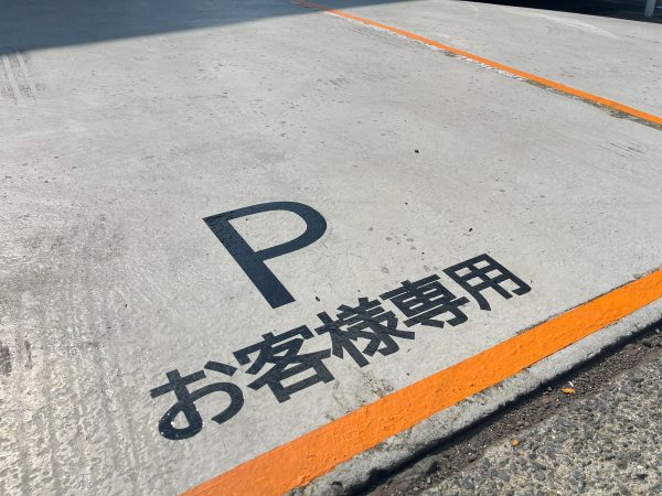 フィルム部門のふみやです。 初めてご利用になられる方でも大通りから駐車スペースがはっきりわかるように「お客様駐車場」を作成しました。 フィルム部門でお客様駐車場のデザインと塗装用マスキングを作成し、塗装部門でラインとマークの塗装を行いました。 日々の作業技術を生かし少しでもお客様が快適に過ごしていただけるよう店内環境改善に努めています!