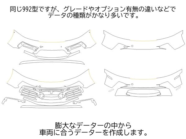 同じ992型でも、カレラ、カレラT、GTS、GT4、GT4RSなど様々グレードが存在し、バンパーの形状など大きく異なります。また、同じグレードでも空気の通りを良くするためのダクト装着されていたり、スポーツパッケージのオプションが付くとカーボンパーツに変更、追加になっているなど1台1台少しずつ違いがあります。