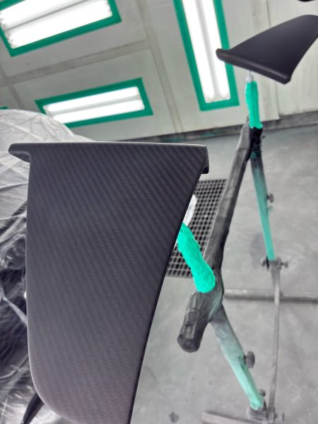 その後、塗装ブース内でセッティングを行い、クリア塗装 へ。