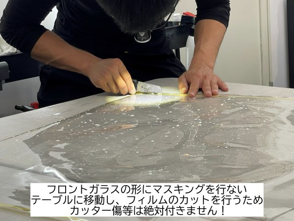 この時のカット作業はは車両の上で行わず、テーブルにフィルムを移動させカット行うため当然車両にはカッター傷等は絶対つきません。