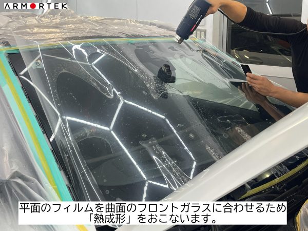 フィルムをフロントガラスの曲面に追従させるため「熱成形」を行います。