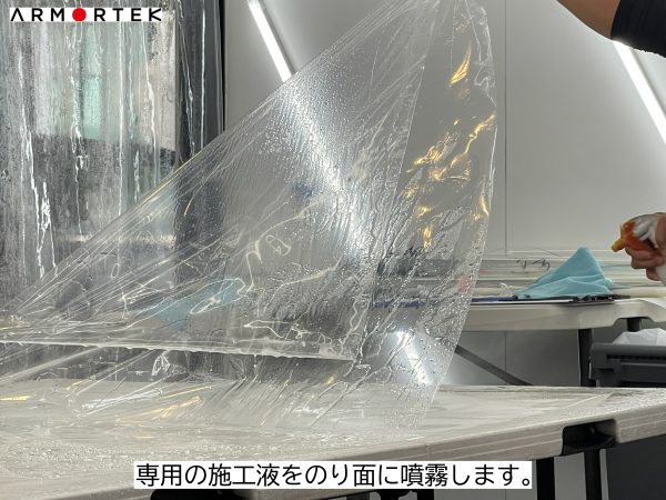 施工時はフィルムのノリ面に専用の施工液を噴霧しフィルムの滑り良くし、位置合わせを容易にした状態にします。