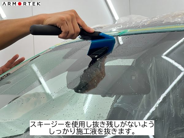 この時、施工液を抜き残してしまうと水分が蒸発した跡等が残ってしまうことがあるため、抜き残しがないよう丁寧にスキージーを行います。