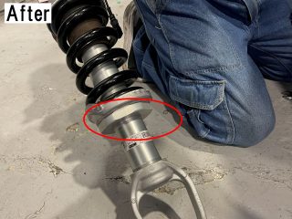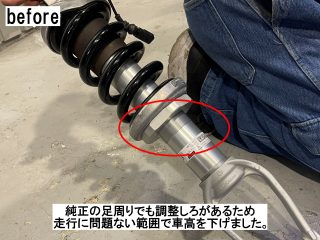 レヴェルトの足周りは純正の状態で調整しろがあり、走行に問題がない範囲で車高を下げました。