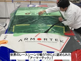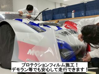 簡単には部品調達ができないGTマシンなのでフロントバンパー、前後タイヤハウス周りにプロテクションフィルム、フロントガラスに弊社が開発した「アーマーテック」を施工しました。